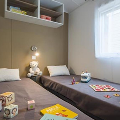Cada mobil-home disposa d’una habitació principal amb vestidor. Les altres habitacions, de belles dimensions, estan equipades amb armaris i llits individuals. L’espai central, ampli i veritable lloc de convivència, fa d’aquest mobil-home un model acollidor, ideal per a famílies o grups d’amics. Ideal per a una estada en mobil-home davant del mar a Espanya.