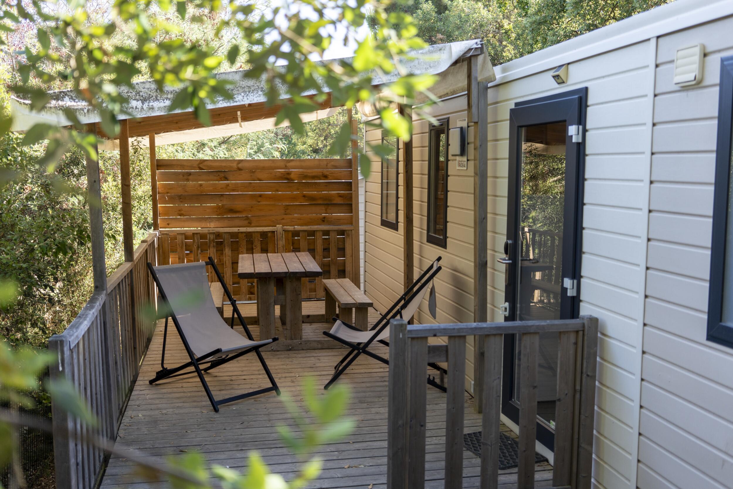 El Cottage Prestige de 2 habitacions (31m²) és un model per a una capacitat de 4 persones. Vista cap al jardí.
