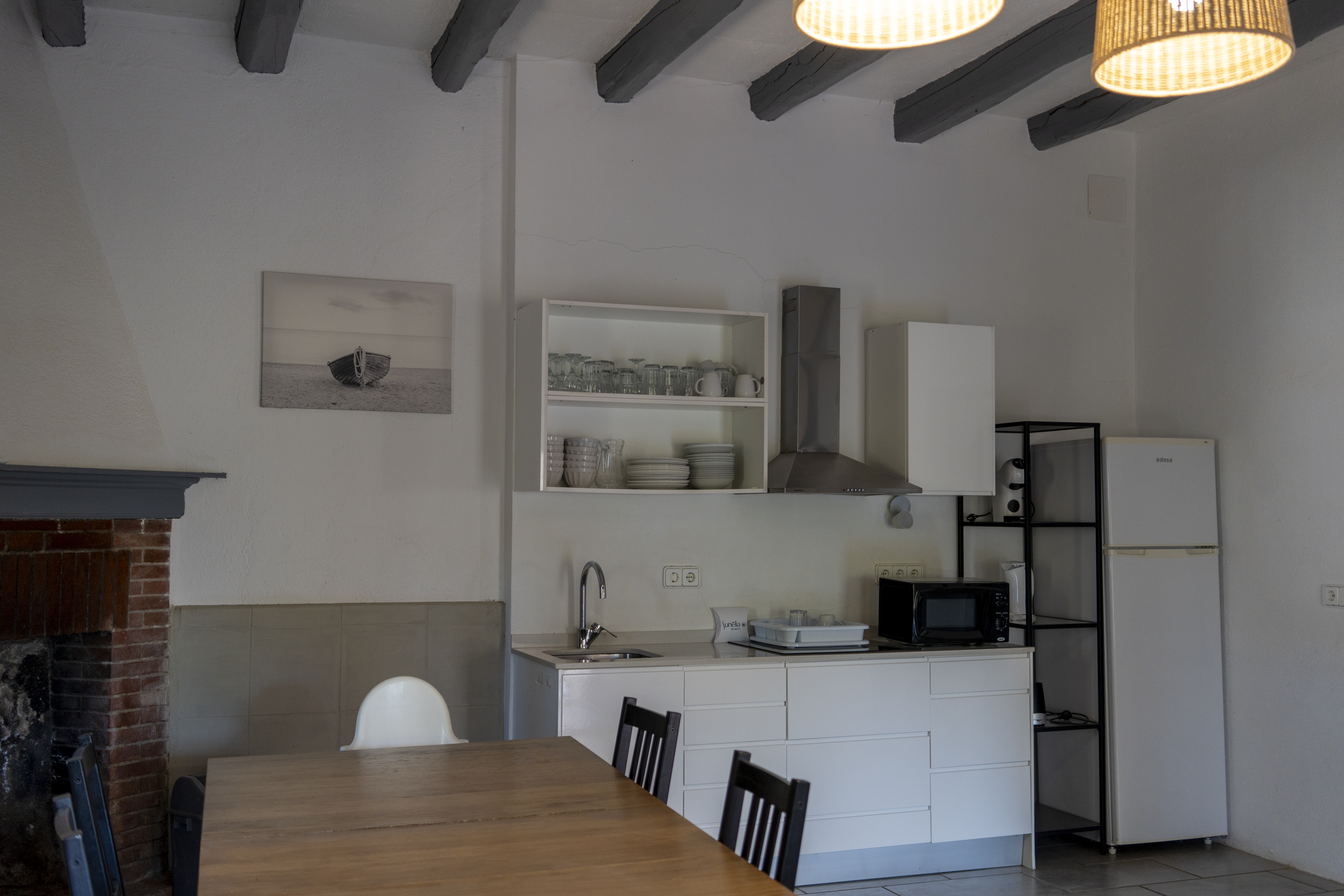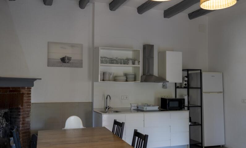 Sala comedor, cocina equipada cafetera Nespresso, utensilios de cocina, vajillas, vasos, cubertería y utensilio de limpieza.
