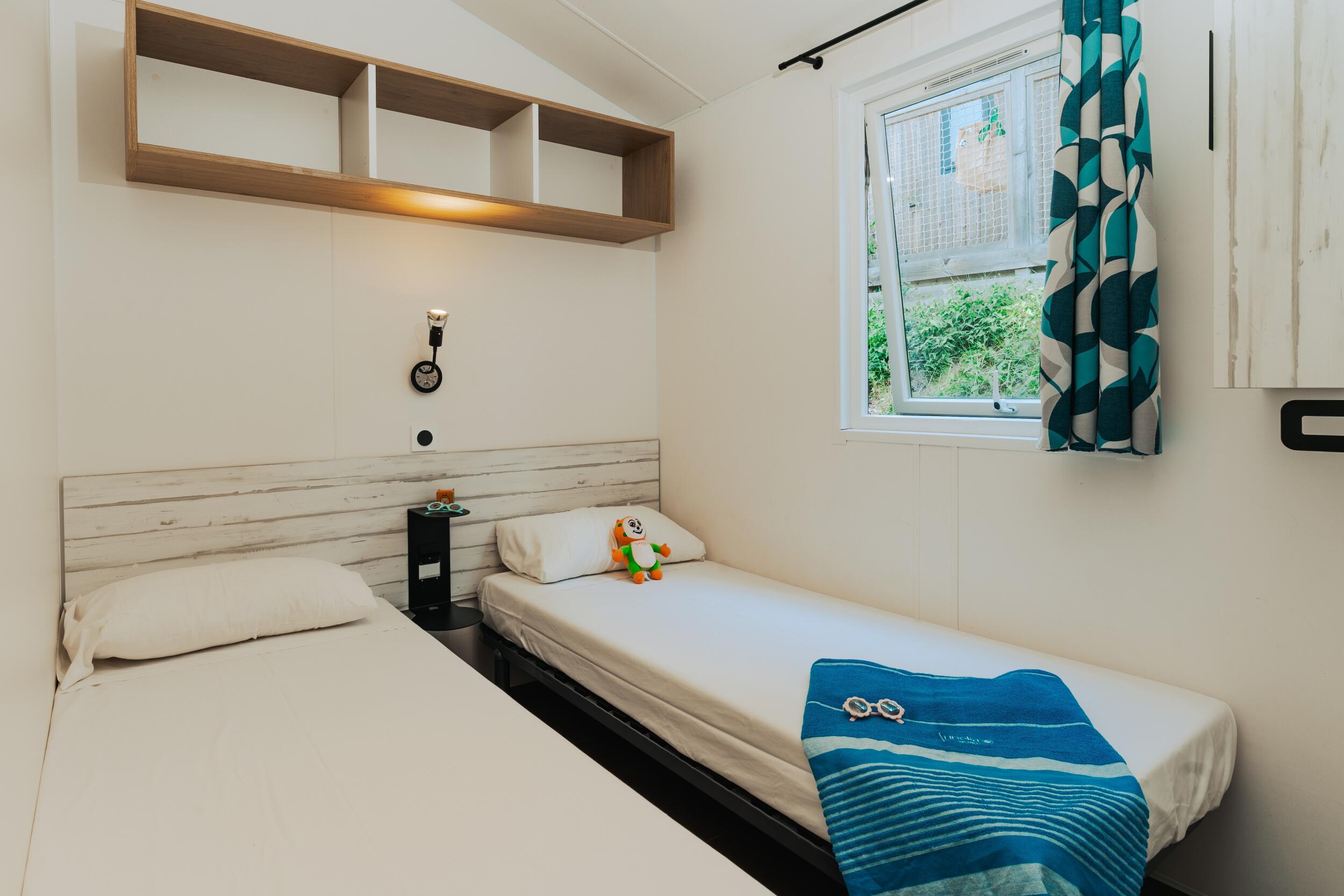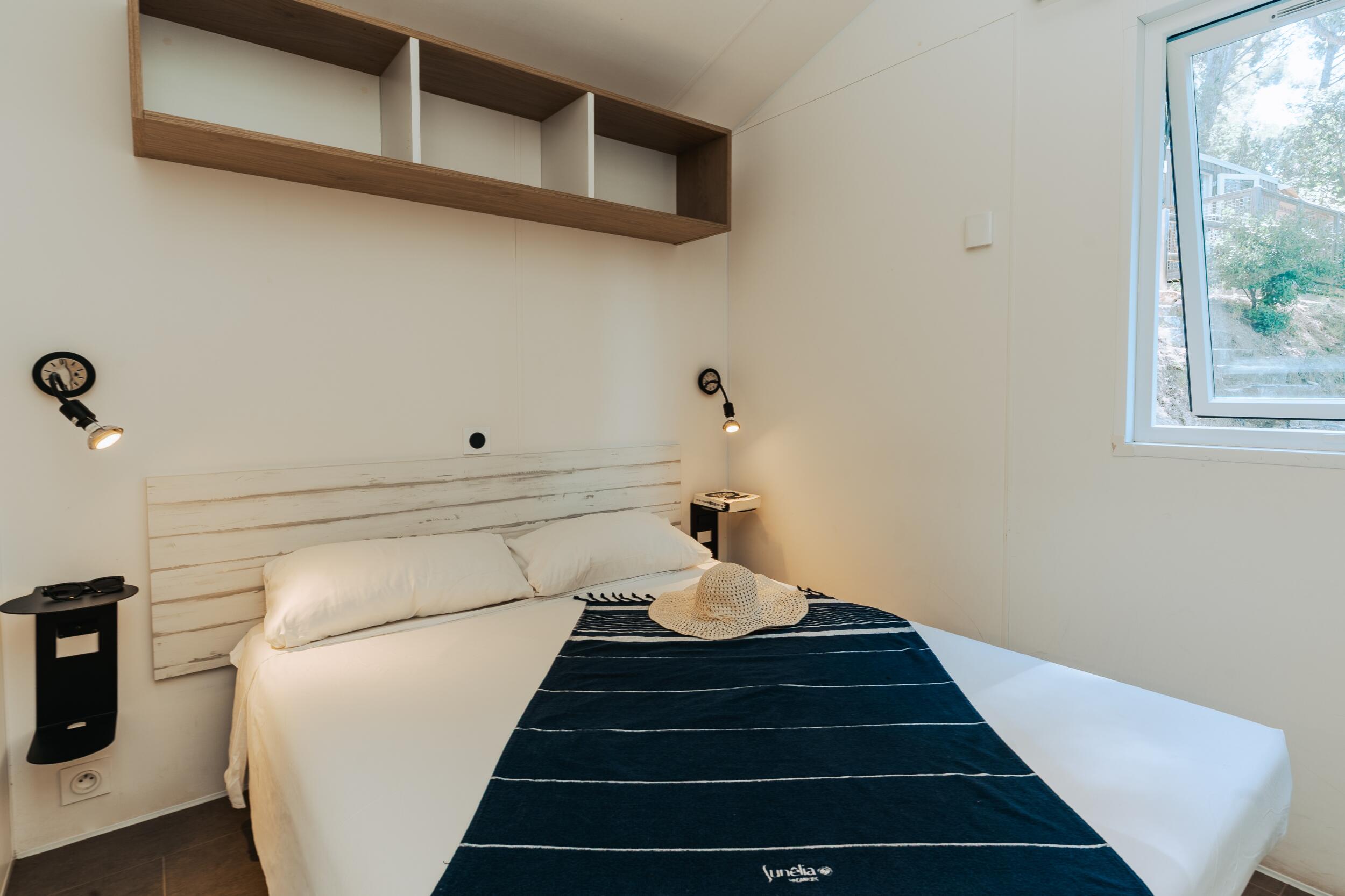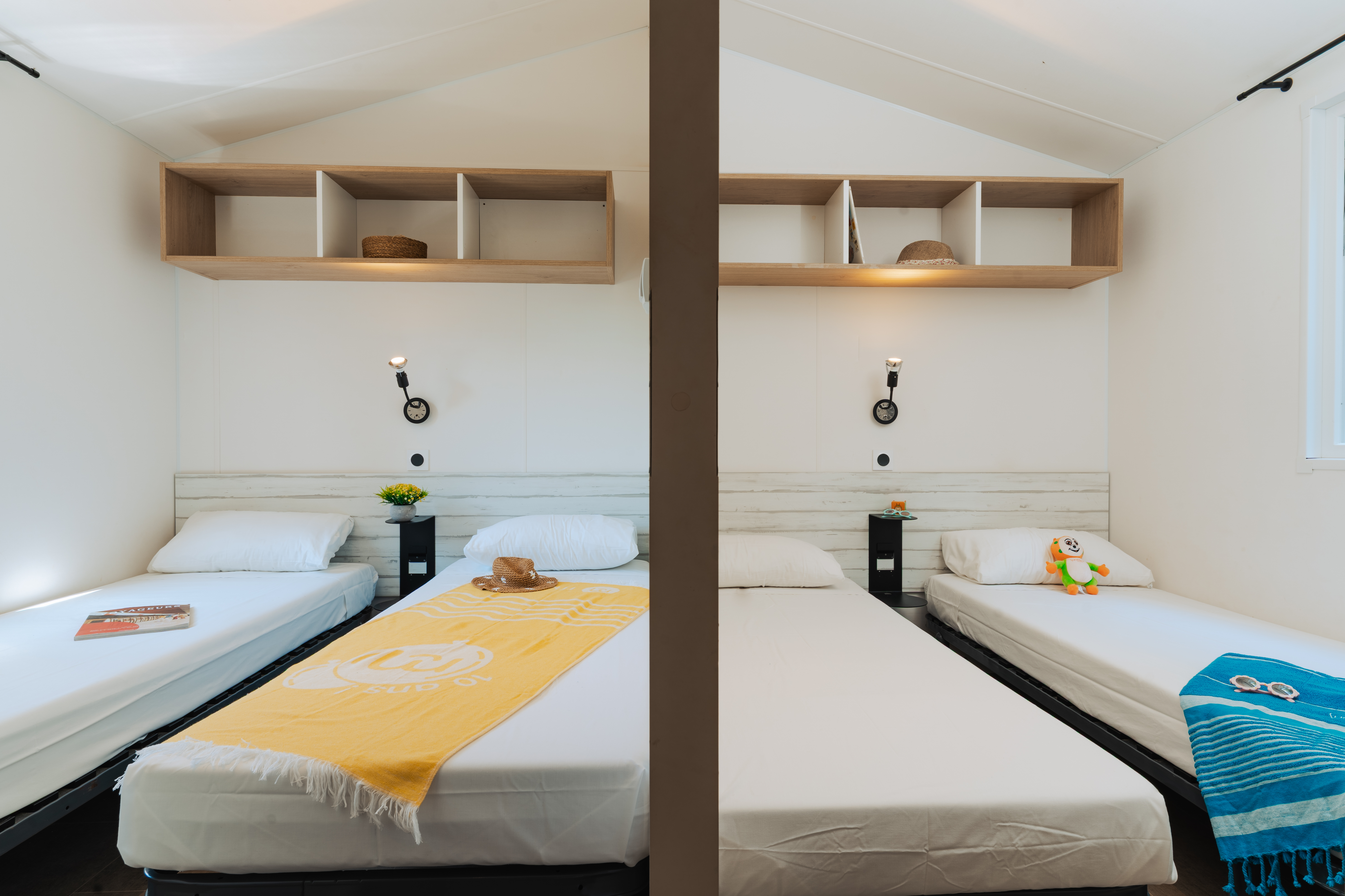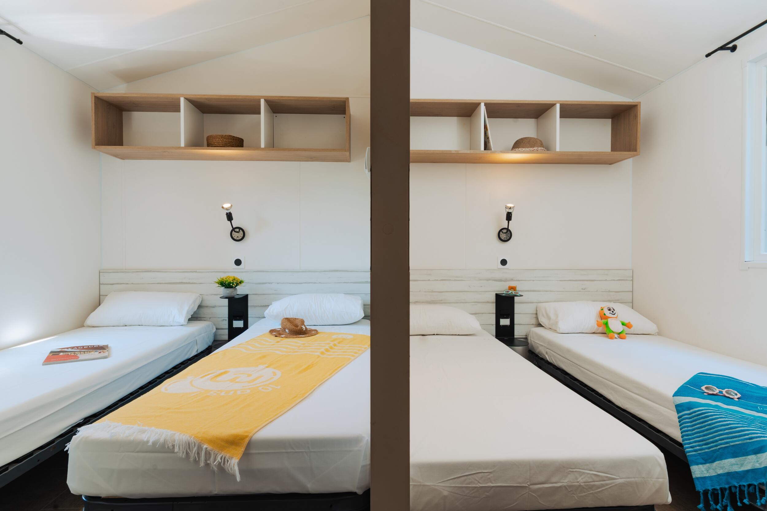 El Cottage Prestigede 3 habitaciones, es un modelo para un aforo de 6 personas, estan ubicados en la parte central del camping zona B color amarillo, poseen una vista parcial al mediterráneo.