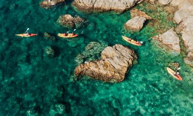 El espacio acuático, centro neurálgico del camping, se divide en varias zonas de baño y relajación: una gran piscina climatizada para natación, aquagym, saltos y baños a temperatura óptima; una zona de chapoteo para jugar en el agua; y un solárium con tumbonas dispuestas alrededor de la piscina para broncearse bajo la sombra de una sombrilla o al sol catalán. La vista impresionante del mar Mediterráneo desde la piscina invita a tomar el acceso que conduce a la playa y a tres calas, fabulosos puntos de buceo y snorkel.