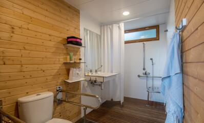 Een badkamer die geschikt is voor personen met beperkte mobiliteit (douche met zitplaats, wastafel en toilet met steunen).